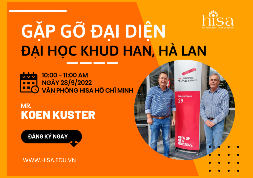 Tháng 9 này, các bạn ở Hồ Chí Minh và tỉnh thành lân cận đừng bỏ lỡ sự kiện hấp dẫn về du học châu Âu nhé. Bên cạnh việc được cung cấp các thông tin chính xác và hữu ích cho kế hoạch du học của bạn – đặc biệt là tại quốc gia Hà Lan, cũng như được các chuyên viên của HISA giải đáp thắc mắc và tư vấn chi tiết, bạn còn có cơ hội gặp gỡ trực tiếp đại diện trường Đại học Khoa học Ứng dụng HAN – HAN University Applied Science nữa đó!